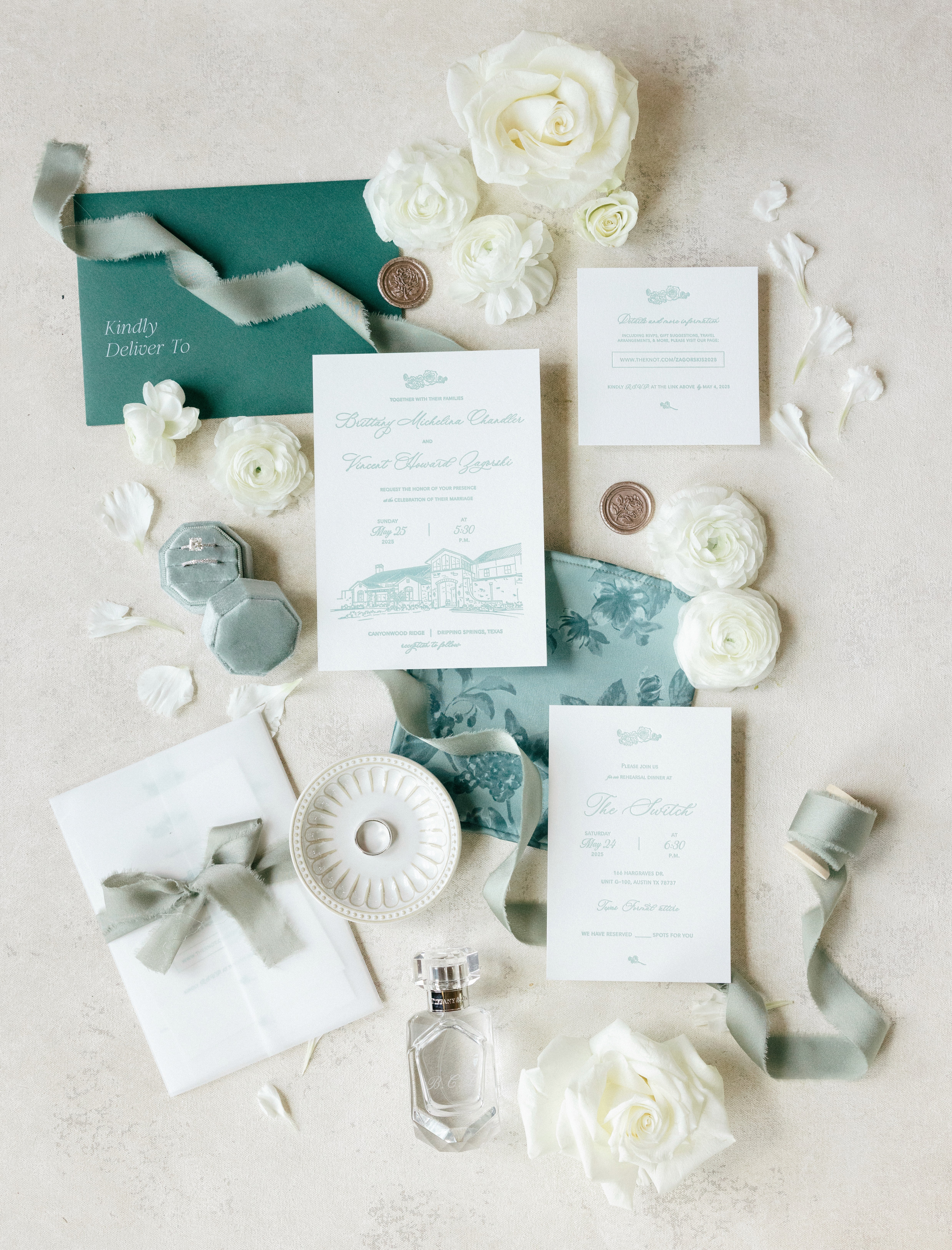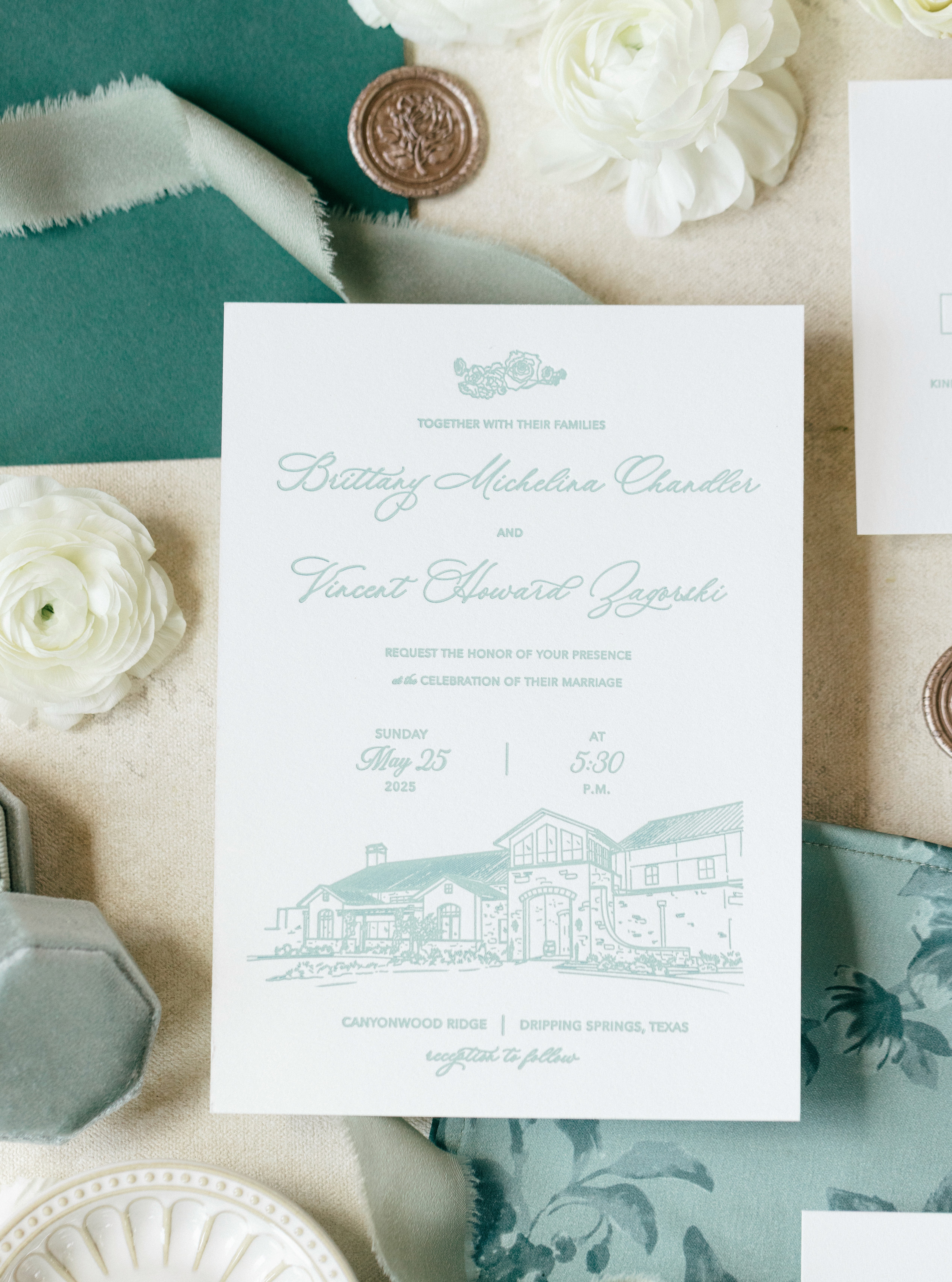 Brittany and Vince got married in Dripping Springs, Texas, in May at a beautiful, classical venue. They wanted to celebrate that venue with a custom architectural illustration and elegant, classic typography, all hand-printed on a letterpress in their key color, a dusty mint green.