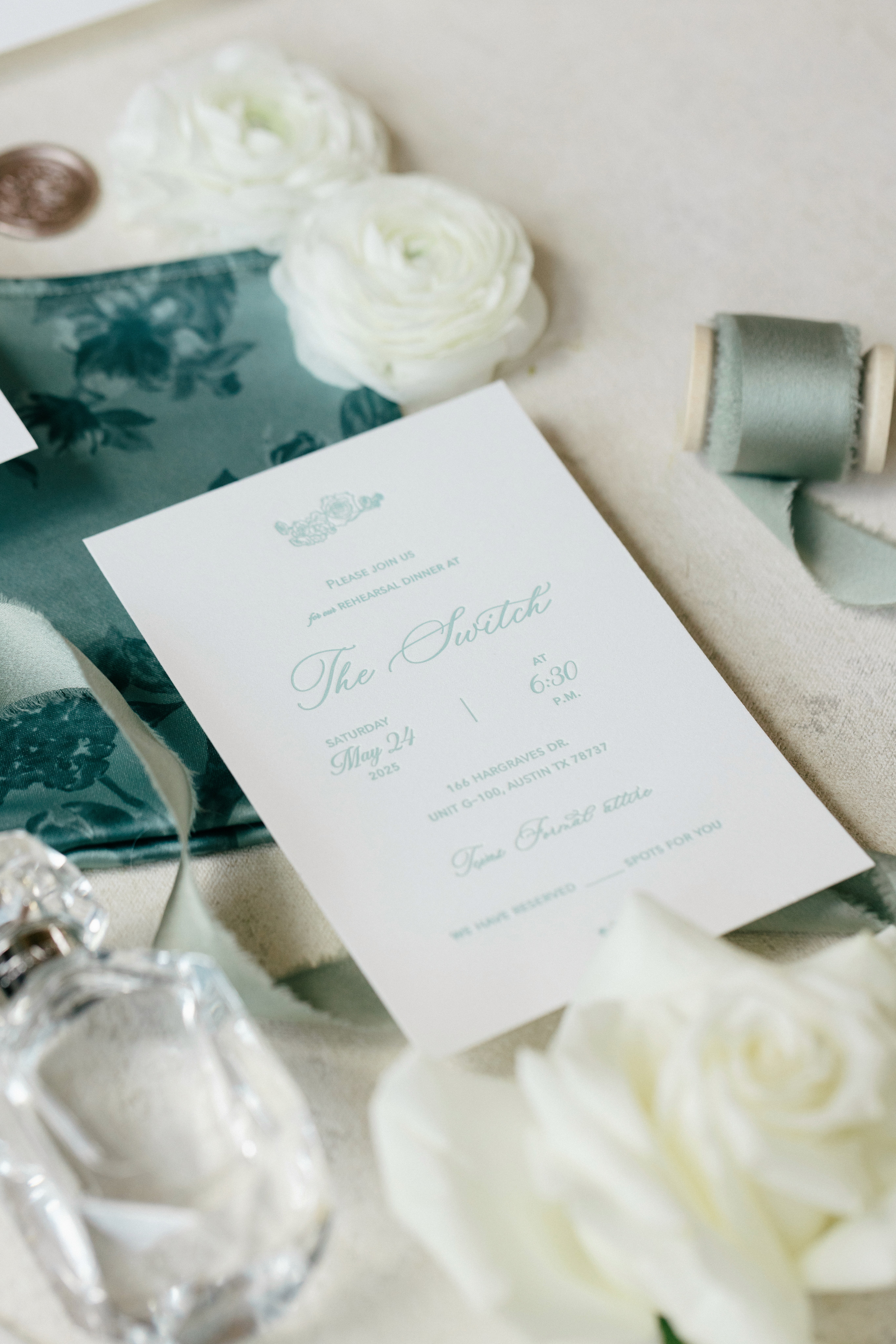 For the full suite, I ensured every printed element was consistent, from the RSVP card to the rehearsal dinner insert, down to the envelopes. The suite styling included a vellum wrapper, edged ribbon, and flowery wax seals.