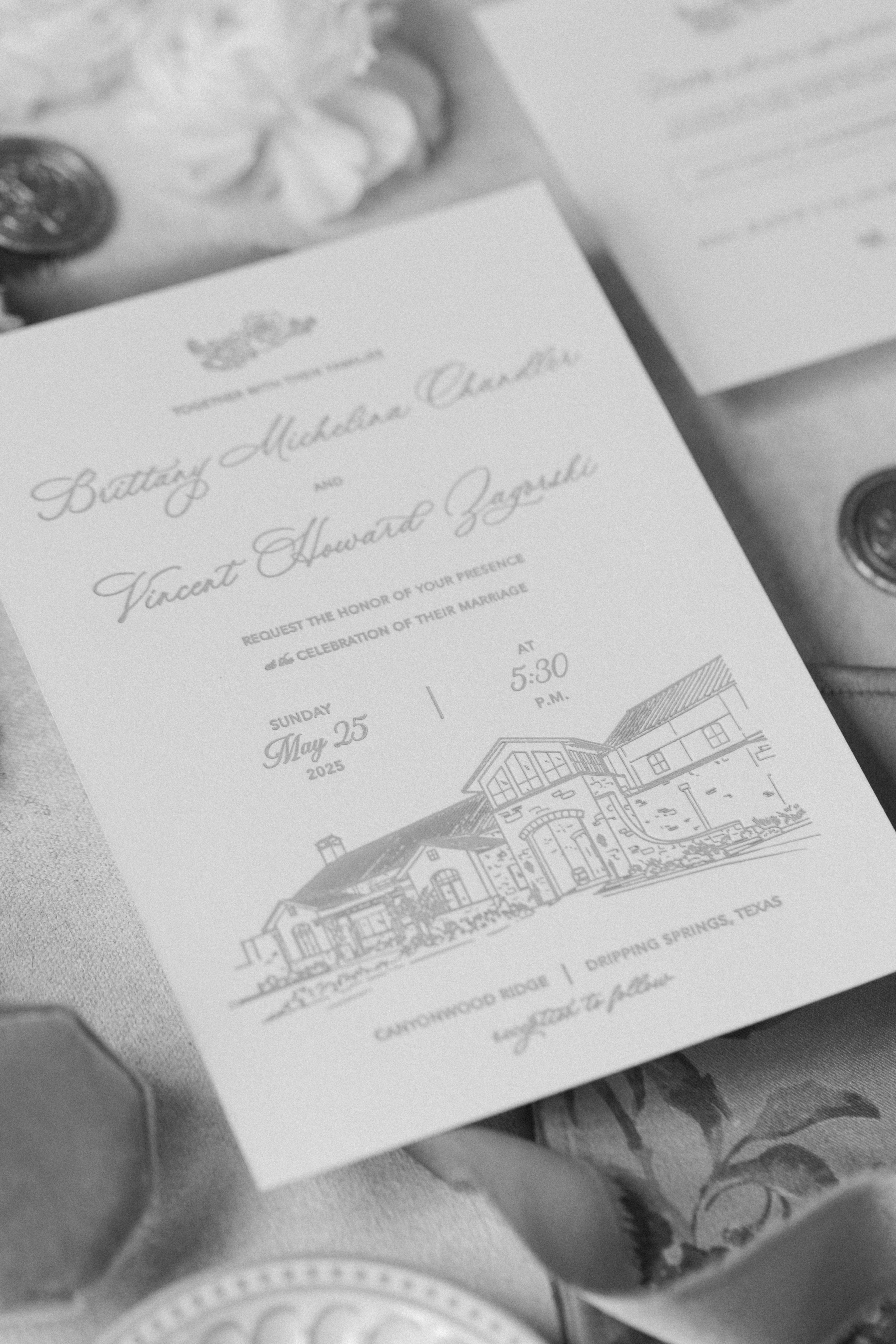 Capture the soul of a place with a hand-drawn or painted illustration of your venue, location, or personal photograph to be included in your full suite, or on its own.